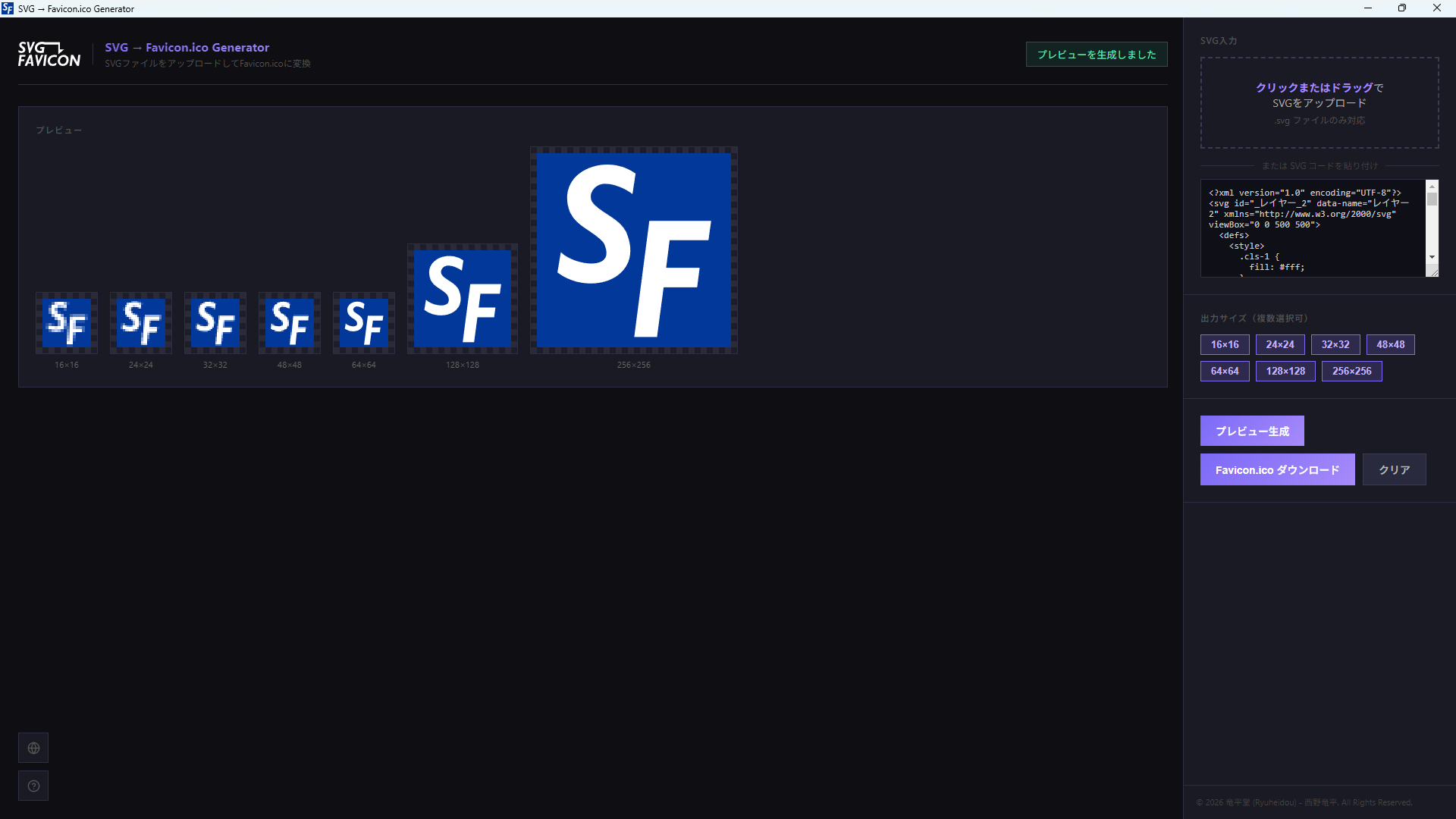 SVGファイルをアップロードするだけで、複数サイズを含む favicon.ico を生成できる Windows 向けデスクトップアプリです。