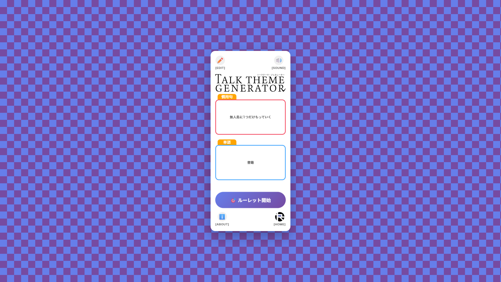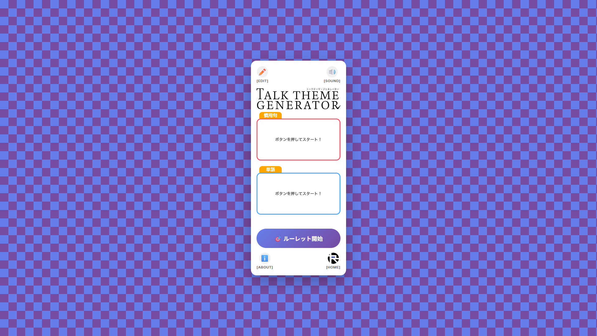 ボタンを押すだけで、慣用句と単語がランダムに選ばれて面白いお題が完成!シンプルで誰でも楽しめます。