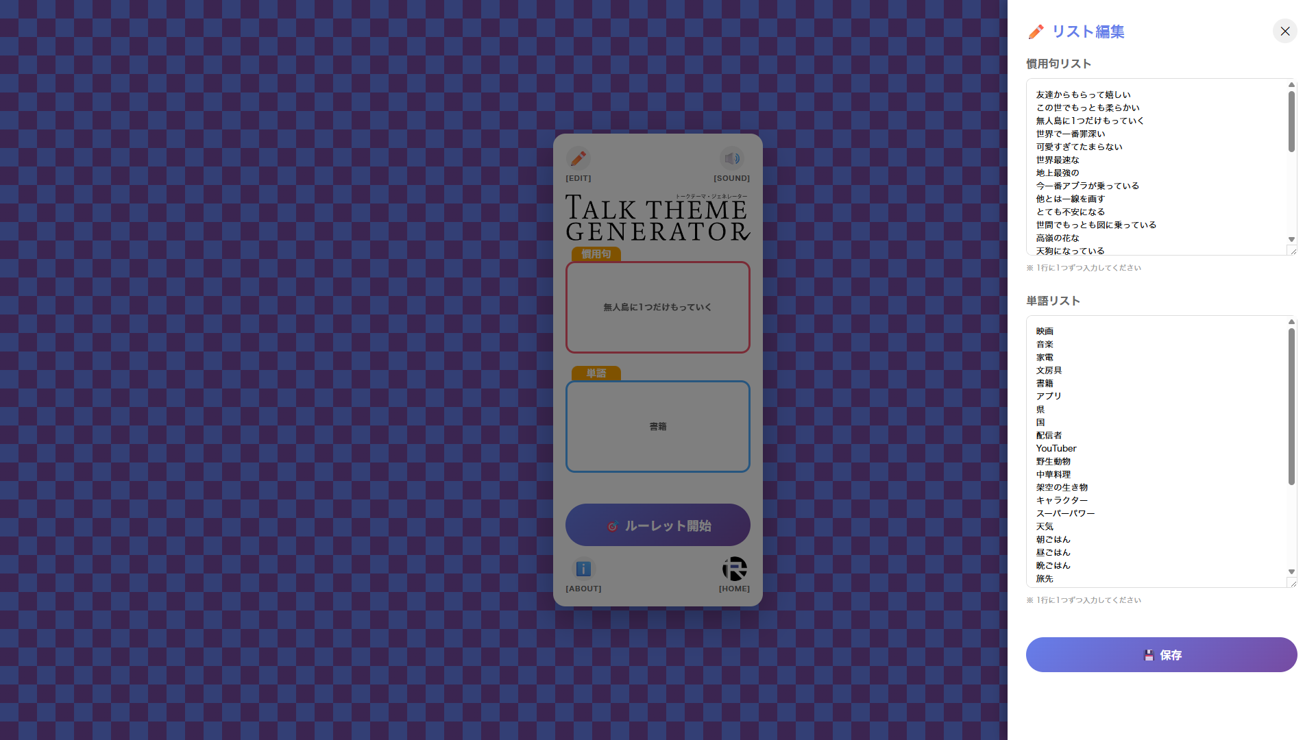 慣用句と単語のリストを自由に編集可能。オリジナルのお題リストを作って楽しもう!